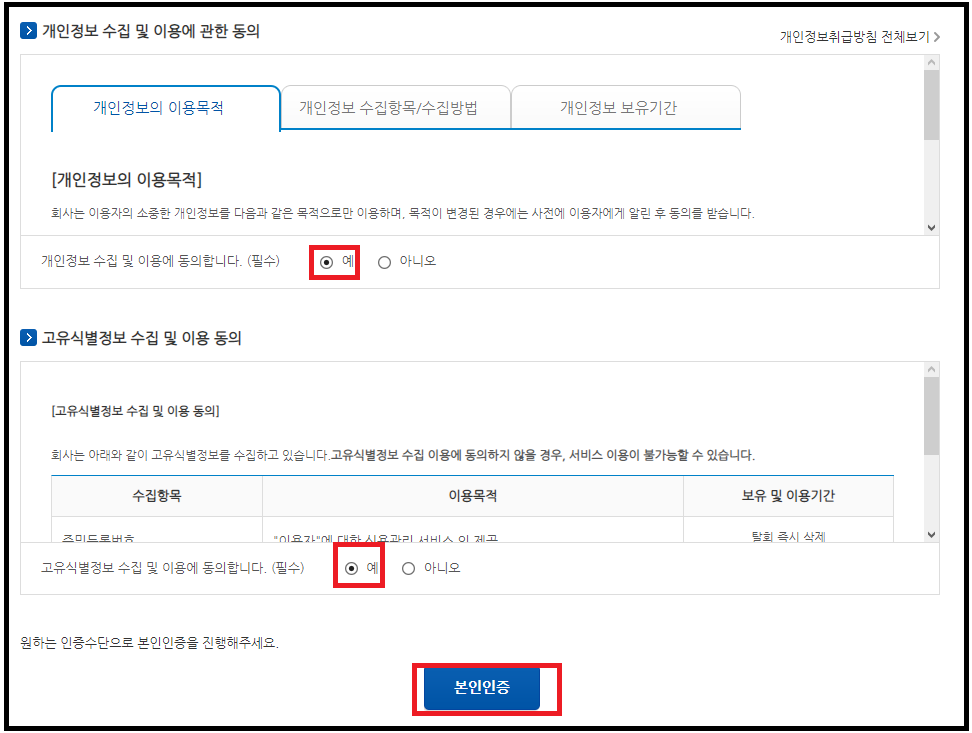 모든 약관 동의 후에 "본인인증" 선택!